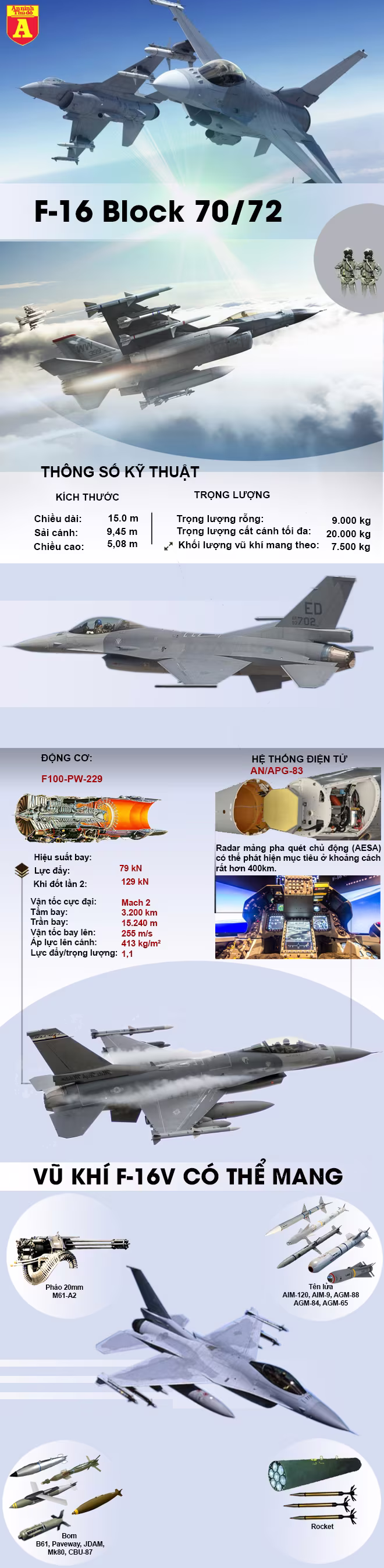 F-16 Block 70/72 là phiên bản mới nhất trong gia đình tiêm kích F-16. Những thay đổi về cấu trúc thân và hệ thống điện tử khiến loại máy bay này có sức mạnh gấp 3 lần phiên bản F-16 trước đây.