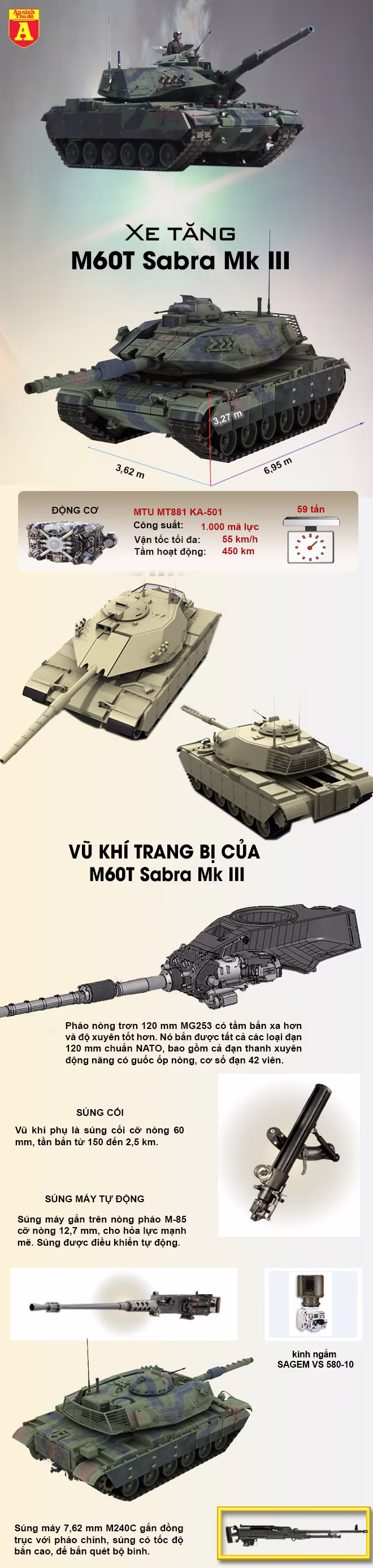 M60T Sabra Mk III chính là phiên bản M60 của Mỹ được Israel hiện đại hóa cho lục quân Thổ Nhĩ Kỳ. Dưới "bàn tay ma thuật" của Israel, loại xe tăng này từng khiến sát thủ diệt xe tăng Kornet của Nga phải thúc thủ.