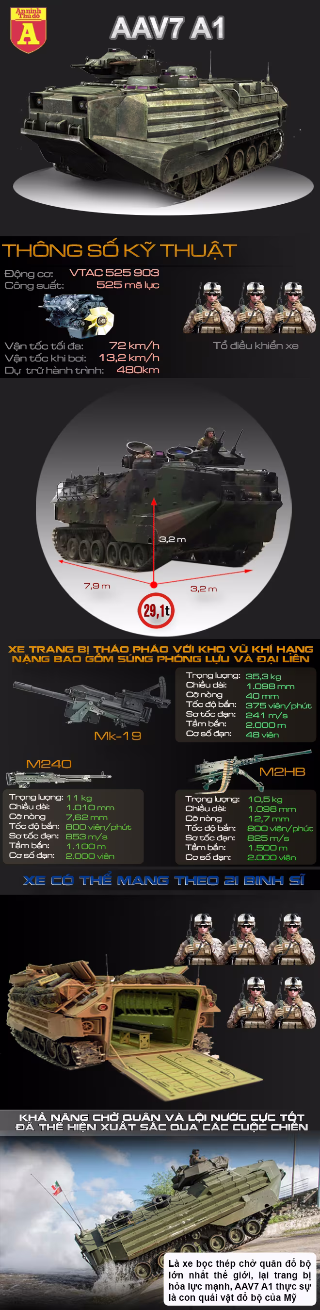 AAV7 A1 là biến thể cuối cùng của dòng xe thiết giáp đổ bộ AAV 7 vốn đi vào phục vụ trong quân đội Mỹ từ những thập niên 1970. So với các loại xe thiết giáp đổ quân cùng thời, xe AAV7 A1 được đánh giá với nhiều ưu điểm như có khả năng mang theo 21 binh sĩ; chạy trên đường nhựa với vận tốc tối đa 72km/h và gần 14 km/h khi bơi (nhanh gấp đôi so với xe của Nga).