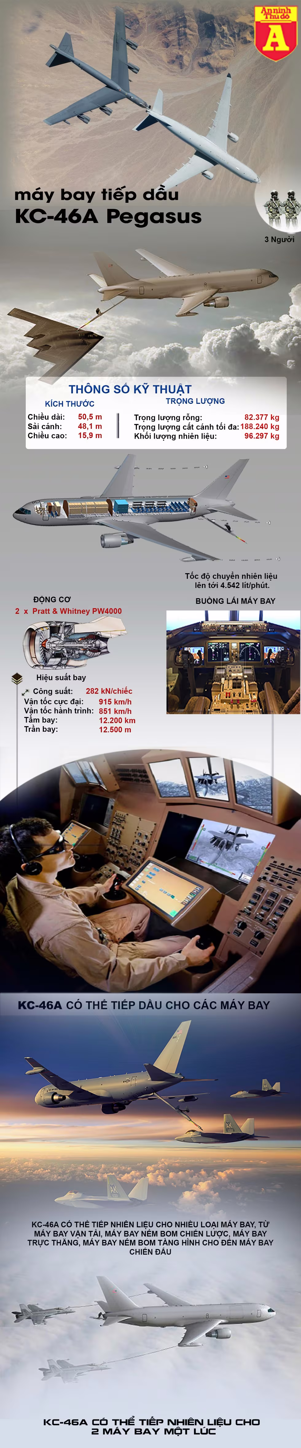 Máy bay tiếp dầu KC-46A biệt danh Pegasus bay thử thành công lần đầu tiên vào tháng 9-2015, mặc dù gặp phải nhiều vấn đề kỹ thuật và chi tiêu vượt quá ngân sách, nhưng cuối cùng Mỹ cũng quyết định đưa loại máy bay tiếp dầu tối tân này vào hoạt động.