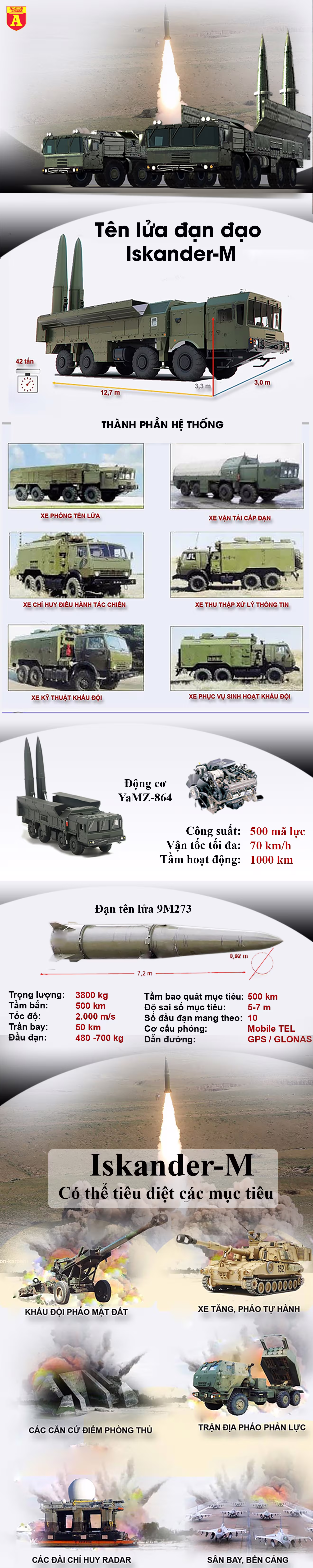 Iskander-M là tên lửa một tầng đẩy sử dụng nhiên liệu rắn, trang bị hệ thống dẫn đường vệ tinh. Loại tên lửa này có thể mang cả đầu đạn thông thường cũng như đầu đạn hạt nhân. Mỗi xe vận chuyển kiêm bệ phóng (TEL) có thể mang 2 quả đạn với khả năng lựa chọn mục tiêu độc lập, tăng gấp đôi hỏa lực so với những tổ hợp cũ hơn như Tochka-U hay Oka.