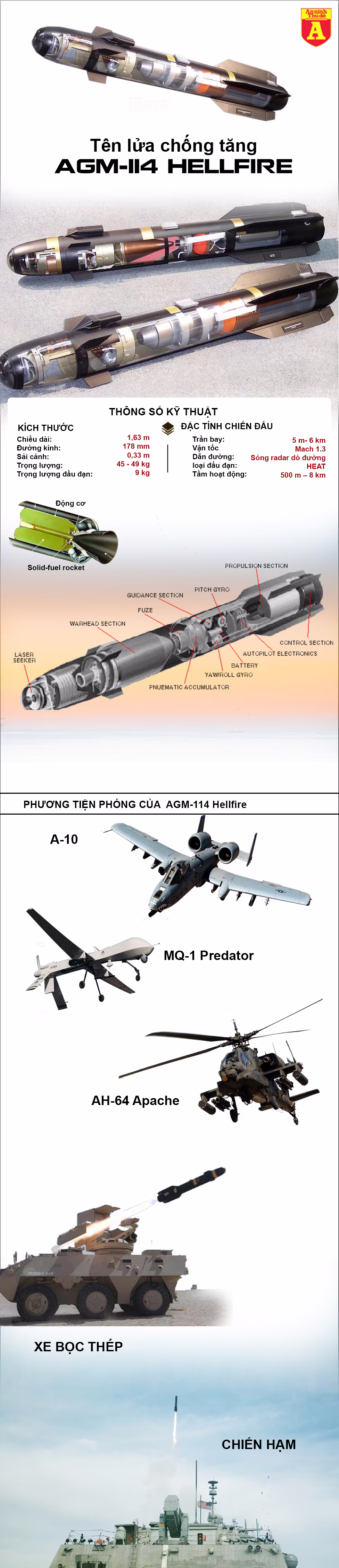 Được đưa vào sử dụng năm 1984, AGM -114 Hellfire là một tên lửa cận âm không đối đất, đa nhiệm vụ, đa mục tiêu có thể được phóng đi từ 20 loại phương tiện chiến đấu khác nhau như tàu chiến, máy bay không người lái, xe chiến đấu...