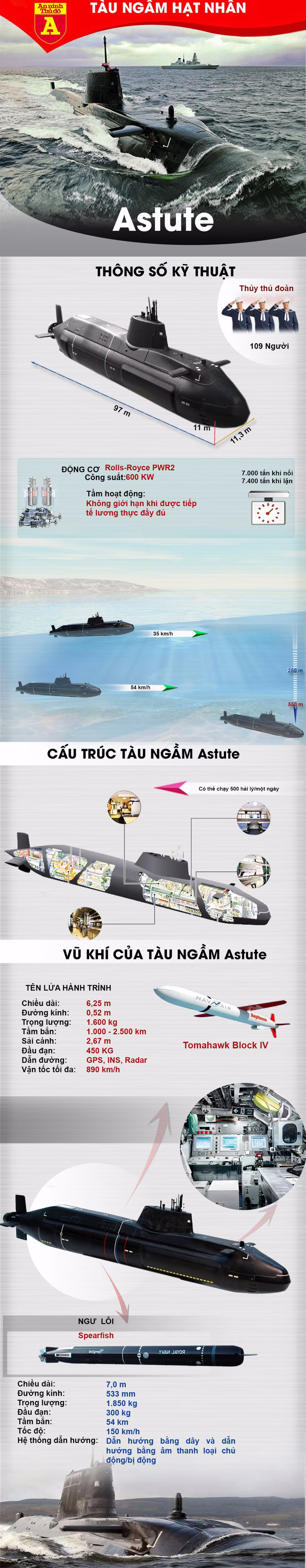 Astute được trang bị 6 ống phóng ngư lôi cỡ 533mm có thể bắn tên lửa hành trình tầm xa, tên lửa hành trình chống tàu, ngư lôi và thủy lôi. Siêu tàu hạt nhân này có thể triển khai trên khắp các đại dương và tấn công bất cứ mục tiêu nào.
