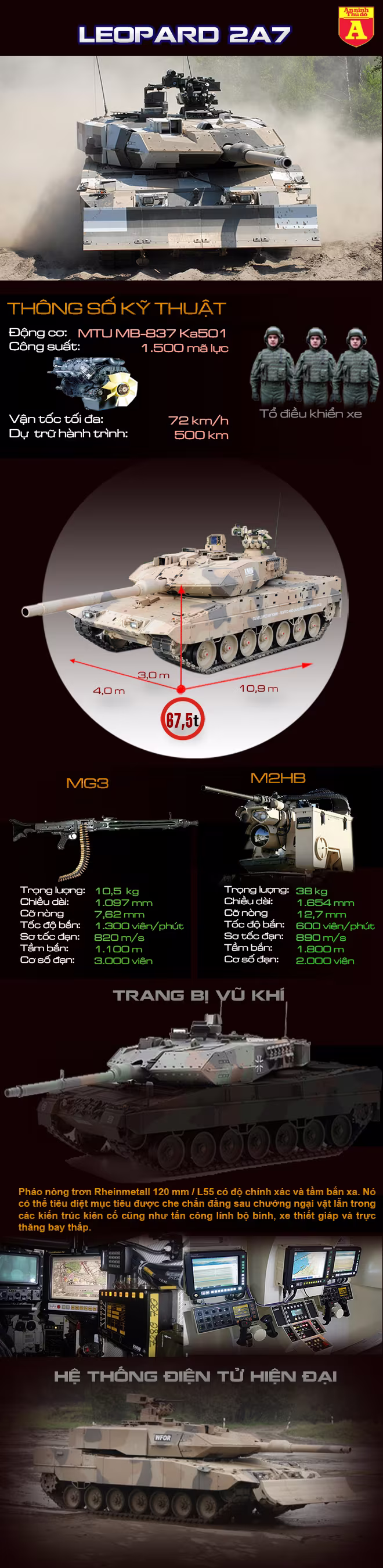Xe tăng Leopard 2A7 được thiết kế đặc biệt để có thể bảo vệ kíp lái chống lại các cuộc tấn công bằng vũ khí sinh hóa của đối phương. Mặc dù nặng tới 67,5 tấn nhưng nhờ trang bị động cơ khỏe, những chiếc tăng này vẫn có thể chạy với vận tốc tối đa lên tới 72km/h.