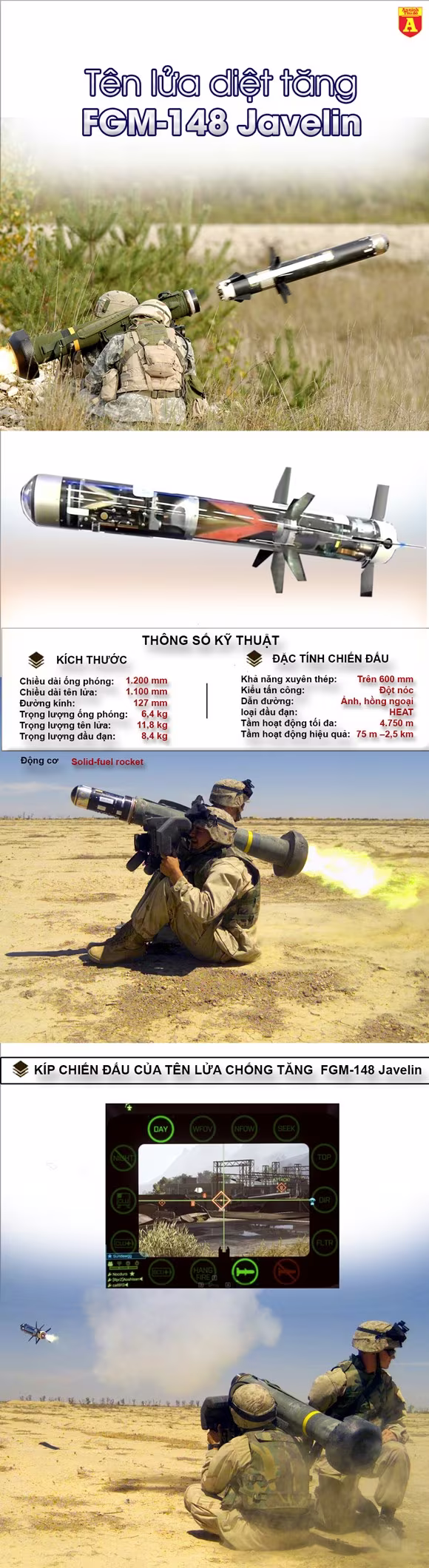FGM-148 Javelin là một tên lửa chống tăng cá nhân, cơ động, gọn nhẹ với tính năng chiến đấu tiên tiến mà không một loại tên lửa chống tăng nào trên thế giới có thể sánh kịp. Ống phóng tên lửa có tích hợp sẵn thiết bị ngắm mục tiêu hồng ngoại, tạo thuận lợi cho xạ thủ trong việc quan sát mục tiêu.