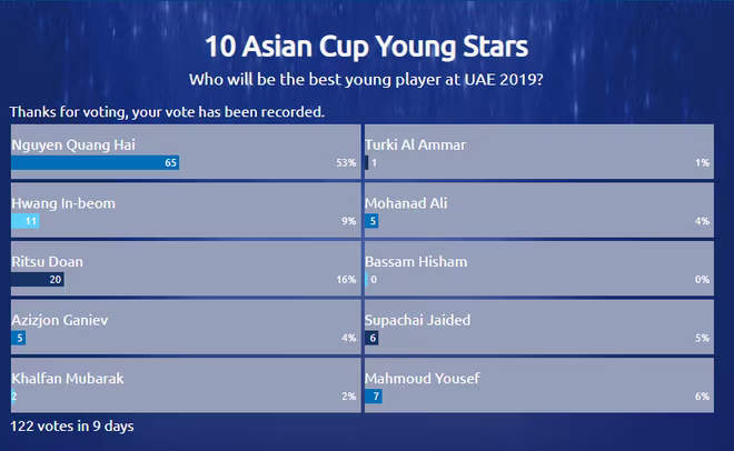 Lúc này, Quang Hải của ĐT Việt Nam đang tạm dẫn đầu trong cuộc bình chọn "Ai sẽ là cầu thủ trẻ xuất sắc nhất Asian Cup 2019", với 65 phiếu chiếm 53%, đứng thứ 2 là Ritsu Doan với 20 phiếu (16%) và thứ 3 là Hwang In-beom với 11 phiếu (9%).