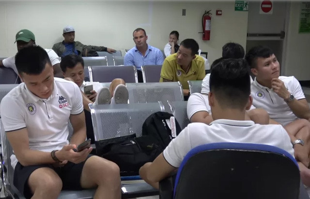 Quang Hải (phải) và các đồng đội Hà Nội FC bị lỡ chuyến bay về Việt Nam