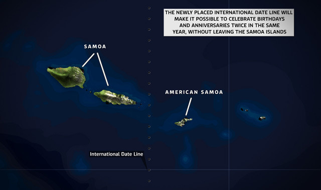Riêng khu vực đảo Samoa thuộc Mỹ thì không thực hiện việc thay đổi này. Điều đó có nghĩa là trên quần đảo Samoa, bạn có thể tổ chức ngày sinh hay các ngày kỷ niệm hai lần trong một năm.