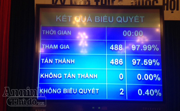 Vào lúc 9h50, với 486 ĐBQH bấm nút tán thành (97,59% tổng số phiếu), Hiến pháp nước CHXHCN Việt Nam (sửa đổi) đã chính thức được thông qua, có hiệu lực từ ngày 1/1/2014.