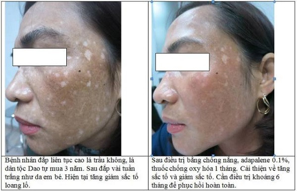 Gần đây, trên mặt xuất hiện những đốm trắng, đốm đen loang lổ theo từng chấm xen kẽ nhau, da càng ngày càng xuống cấp trầm trọng, chị mới đến Bệnh viện Da liễu Trung ương khám. Các bác sĩ chẩn đoán, bệnh nhân bị bệnh giảm sắc tố kiểu rắc hoa giấy do đắp lá trầu không gây ra.