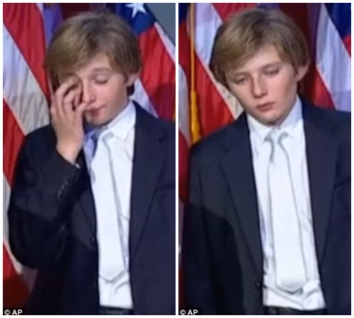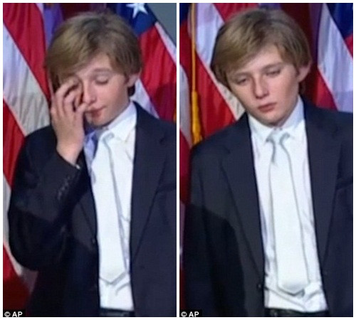 Xuất hiện cùng cha trên sân khấu, cậu út Barron Trump nhanh chóng được chú ý vì một gương mặt ngái ngủ đầy biểu cảm trước ống kính máy quay. Dù đứng đằng sau cha, trong lúc ông Trump có bài phát biểu dài lúc 3 giờ sáng nhưng Barron thậm chí lại được nhiều người chú ý hơn cả cha.