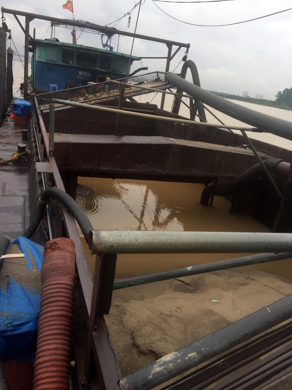 Qua kiểm tra, trên tàu có Đỗ Quốc Khánh (SN 1962, trú tại: đội 5, xã Cao Đại, huyện Vĩnh Tường, tỉnh Vĩnh Phúc, là chủ tàu) và Đào Văn Huần (SN: 1962, trú tại khu 5, thị trấn Kẻ Sặt, huyện Bình Giang, tỉnh Hải Dương) đang vận hành hệ thống gồm đầu nổ, sên vòi, ống hút gắn trên tàu hoạt động khai thác cát lòng sông đưa lên khoang chứa của tàu.