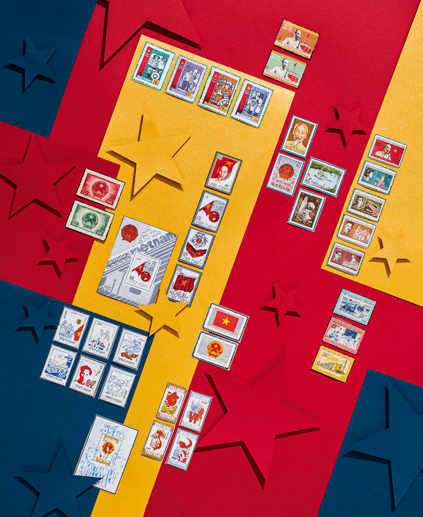 Bộ ấn phẩm “Hải trình rực rỡ” với điểm nhấn trong thiết kế là chân dung Chủ tịch Hồ Chí Minh ở vị trí trung tâm, bao quanh bởi những biểu tượng giàu ý nghĩa như: con tàu vượt sóng, chim Lạc tung cánh, mặt trời rực rỡ… Tất cả hòa quyện, khắc họa khát vọng vươn ra biển lớn và đích đến tự do, hạnh phúc của dân tộc.