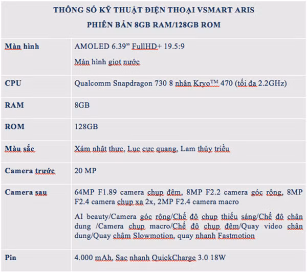 Vsmart Aris phiên bản nâng cấp được trang bị cấu hình và nhiều tính năng hấp dẫn với cụm 4 camera chuyên nghiệp 64MP, màn hình AMOLED 6.39” cùng với thiết kế khung kim loại lưng kính nhám sang trọng và chắc chắn. Sản phẩm được trang bị viên pin lớn 4.000 mAh sạc nhanh 18W cùng với công nghệ giả lập âm thanh không gian đa hướng hiện đại Spatial Upmix Gaudio. Nhờ đó, Vsmart Aris mang đến trải nghiệm phim ảnh, âm nhạc và chơi game với âm thanh sống động ngay trên điện thoại dành cho người dùng.