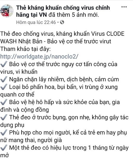 Cụ thể, trên một số group và tài khoản Facebook cá nhân đang lan truyền thông tin về một loại “Thẻ kháng khuẩn chống virus chính hãng tại Việt Nam”, giới thiệu sản phẩm “Thẻ đeo chống virus, kháng khuẩn Virus CLODE WASH Nhật Bản - Bảo vệ cơ thể trước virus” có tác dụng thần kỳ là bảo vệ cơ thể trước nguy cơ tấn công của virus, vi khuẩn; ngăn chặn lây nhiễm, dịch bệnh, cảm cúm…