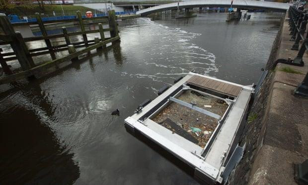| Toàn cảnh hệ thống cột bong bóng thu gom chất thải nhựa trên sông IJssel ở Amsterdam, Hà Lan |