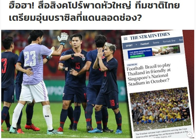 Tờ Siamsports của Thái Lan hôm nay bày tỏ hoài nghi, thậm chí còn pha chút châm biếm khi chạy tít: "Hài hước, báo Singapore đưa tin Thái Lan giao hữu Brazil?".
