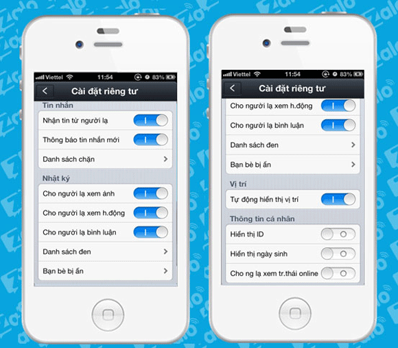 Song song với việc bổ sung các tính năng giải trí, Zalo cũng cập nhật hàng loạt tính năng bảo mật thông tin khách hàng. Người dùng yêu thích sự riêng tư cũng hoàn toàn có thể yên tâm sử dụng Zalo với nhiều tuỳ chỉnh như không nhận tin nhắn từ người lạ; chặn tin nhắn từ một số tài khoản; không cho người lạ xem hình ảnh, hoạt động hay bình luận trên trang cá nhân của mình; bổ sung danh sách đen (blacklist) những bạn bè không được xem hoạt động ở Trang cá nhân và Nhật ký; lựa chọn danh sách bạn bè sẽ không hiển thị hoạt động trên trang Nhật ký cá nhân, tắt hiển thị vị trí (dùng cho tính năng Tìm bạn quanh đây),…