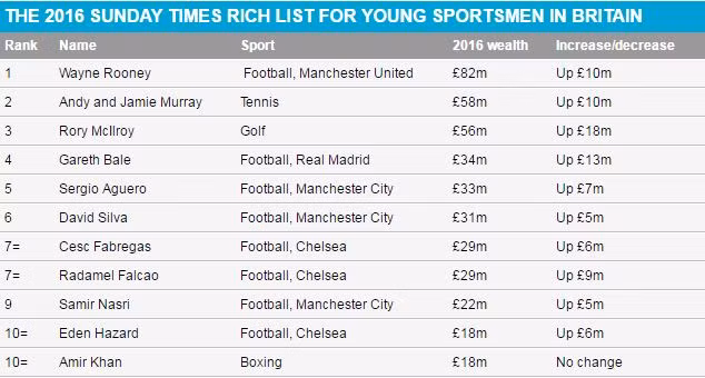 Ngôi sao của Real Madrid, Gareth Bale giữ vị trí thứ tư trong danh sách, 1 năm sau khi trở thành cầu thủ bóng đá giàu thứ hai tại Vương quốc Anh. Cựu cầu thủ của Tottenham kiếm được 15,6 triệu bảng/năm tại Bernabeu theo các bản hợp đồng với Adidas, Sony và Electronic Arts. Tổng tài sản của Bale ước tính vào khoảng 34 triệu bảng, tăng 13 triệu bảng so với năm 2015.