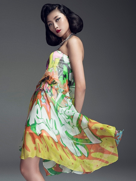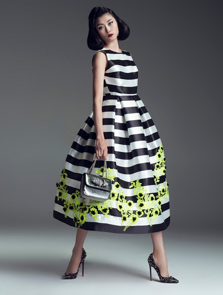 Họa tiết sọc ngang của chiếc đầm xòe được phá cách bởi các họa tiết hoa thêu, chấm bi màu sặc sỡ
