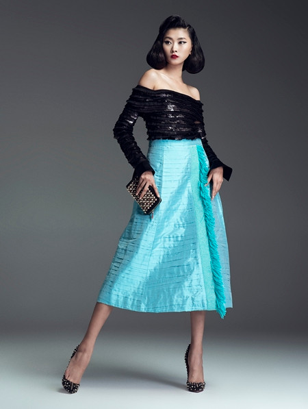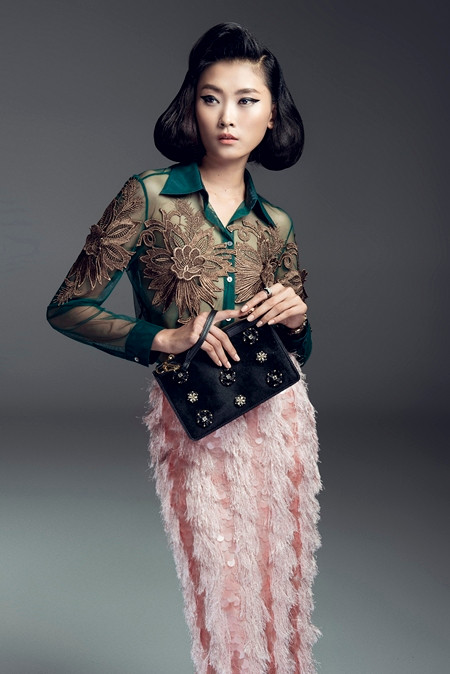 Váy bút chì cổ điển được thực hiện trên chất liệu sợi cao cấp đính kết cầu kì kết hợp với áo sơ mi lưới cùng họa tiết ren thêu tạo nên tổng thể mới lạ
