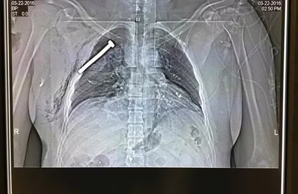 Ảnh chụp X-quang cho thấy một chiếc đinh nhọn găm chặt vào trong lồng ngực của nạn nhân