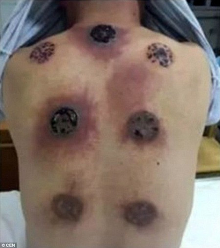 Thay vì ngừng điều trị bằng phương pháp này, ông Li yêu cầu vợ chọc vỡ các mụn nước và xoa vết thương hở bằng dầu cũng như tiếp tục đến trung tâm giác hơi.