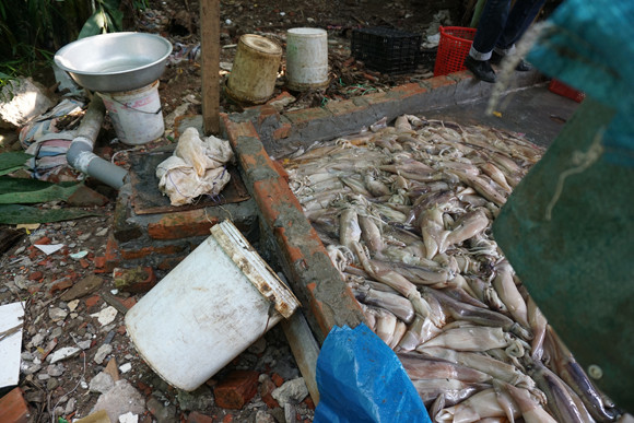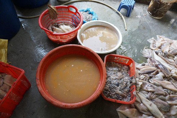 "Nhà xưởng" chế biến mực bẩn thành mực trắng rất tạm bợ...
