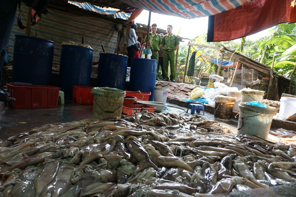 Tại thời điểm kiểm tra, tổ công tác phát hiện số lượng lớn mực đang có nguy cơ phân hủy, bốc mùi xú uế được đổ ra nền xi măng để tẩy rửa. Cùng với đó một số mực đã được tẩy trắng đựng trong thùng phuy nhựa nổi váng bọt không đảm bảo VSATTP.