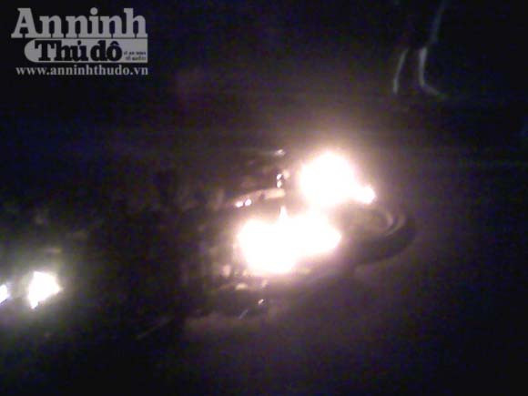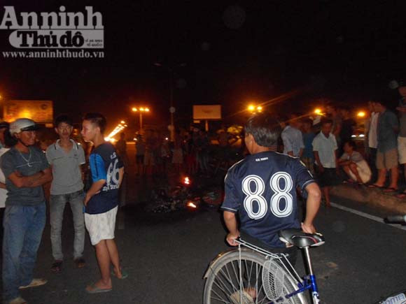 Một đối tượng trên xe máy nhanh chân chạy thoát thân, đối tượng còn lại bị nhiều người xông vào đánh hội đồng. Chiếc xe máy của 2 đối tượng lập tức bị đốt cháy thành than.