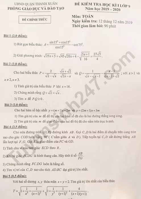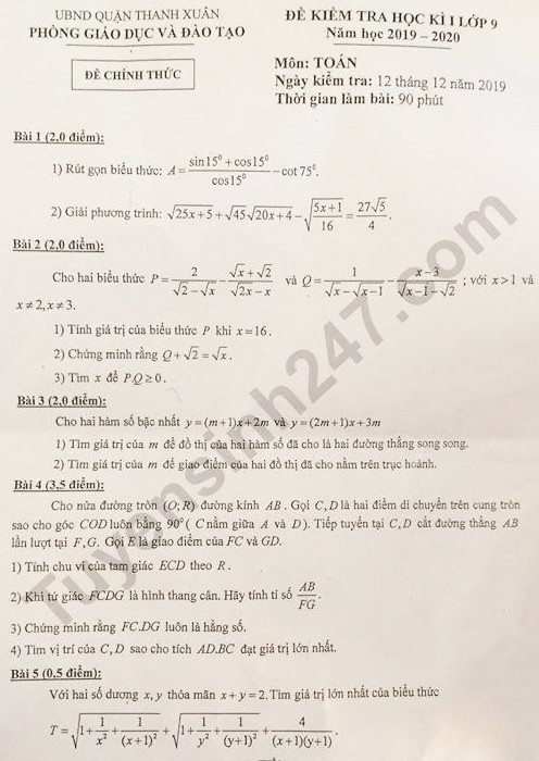 Ngày 12/12, học sinh lớp 9 của các trường THCS ở quận Thanh Xuân thi hết học kỳ I năm học 2019-2020, có đề thi chung môn Toán. Tuy nhiên, khi có kết quả, nhà trường thông báo cho toàn bộ học sinh thi lại vào ngày 17/12 với lý do điểm Toán trên toàn quận rất thấp.