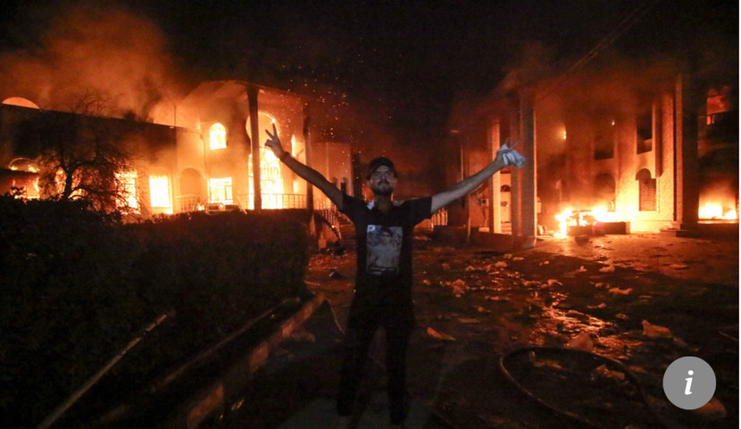 Một người biểu tình ở Iraq bên ngoài lãnh sự Iran đang cháy