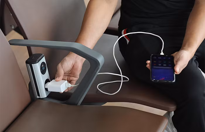 Hai bên ghế có ổ cắm sạc điện, usb, vô cùng tiện lợi cho du khách, xóa bỏ tình trạng “tìm mỏi mắt không thấy ổ cắm điện” tại nhiều sân bay hiện nay.