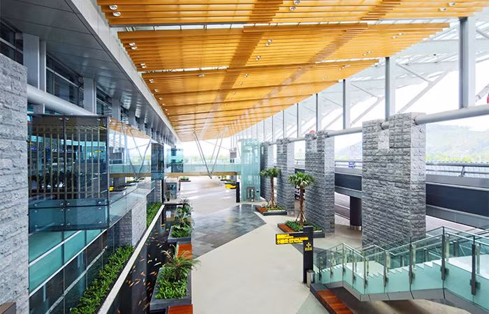Bên cạnh đó, đội ngũ kiến trúc sư đã đưa vào sân bay những vật liệu kiến trúc ứng dụng công nghệ hiện đại, thân thiện với môi trường. Điển hình là hệ thống mái che khu sảnh ngoài gồm 3 lớp: mái kính Low-E giúp giảm bức xạ nhiệt, kết cấu thép và hệ thống mái lam gỗ giúp chống nóng, đảm bảo tính thẩm mỹ và tạo hiệu ứng thị giác vô cùng độc đáo đem lại nét đẹp rất phóng khoáng, sang trọng cho tổng thể không gian kiến trúc nội thất.