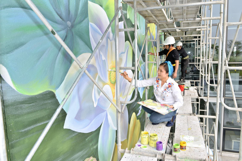 Trong tháng 11 và tháng 12/2018, họa sỹ Thu Thủy và 9 họa sỹ Công ty Nghệ thuật Tân Hà Nội đã miệt mài vẽ những lá sen hoa sen khổng lồ trên 8 tầng giàn giáo. Họ đã phối hợp với nhau rất ăn ý để dù mỗi người vẽ một góc tranh nhưng đồng nhất về phong cách và biến phác thảo 1,5m2 của họa sỹ Thu Thủy thành bức tranh tường lớn có diện tích 360m2.