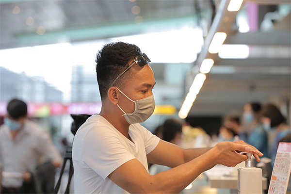 Hành khách rửa tay bằng nước sát khuẩn tại sân bay Vân Đồn