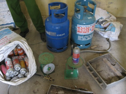 Tang vật Cơ quan công an thu giữ tại đây gồm 2 bình gas loại 12kg, 2 khay san chiết gas và trên 200 bình gas mini trong đó phần lớn đã được san chiết.
