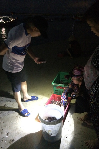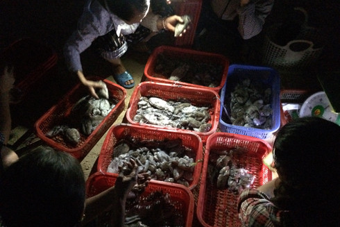 Sóng đưa chòng chành, đèn đêm chớp rọi vào lòng thuyền đã thấy cá, mực, cùm (một loại cua đá)... sắp đầy chậu, rổ, đủ loại. Người mới chưa quen, sợ ướt quần áo nên phải cúi thật sát, gí đèn thật sáng mới thấy hàng hải sản. Ông chủ thuyền thúng một tay chống mái chèo, một tay đếm tiền la lớn: “Chỉ có mực, không có tôm…”. Loáng cái lòng thuyền đã bị vét sạch, còn trơ giỏ đồ chứa cặp lồng cơm, nước uống. Sau một đêm bám biển gần bờ, anh thu được gần 1 triệu đồng. Doanh thu này có thể cao gấp đôi nếu chờ đến sáng khi nhiều người mua hơn. Tuy nhiên, đêm nay “hàng” về là cá mực loại nhỏ, anh không muốn… tồn kho. Bởi khi trời sáng, thuyền về càng nhiều tương đương với việc cạnh tranh lớn hơn, bán cũng lâu hơn và hải sản bớt tươi hơn.