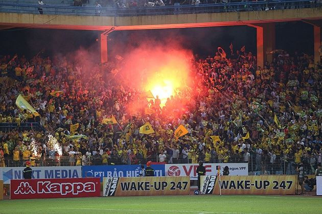 Pháo sáng tại khu vực cổ động viên SLNA, trận làm khách sân Hàng Đẫy ở vòng 4