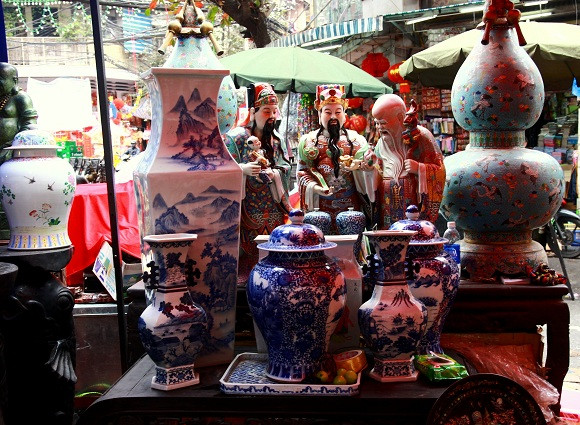 Các loại bình sứ và tượng 3 ông Phúc - Lộc - Thọ cũng được bày bán tại đây