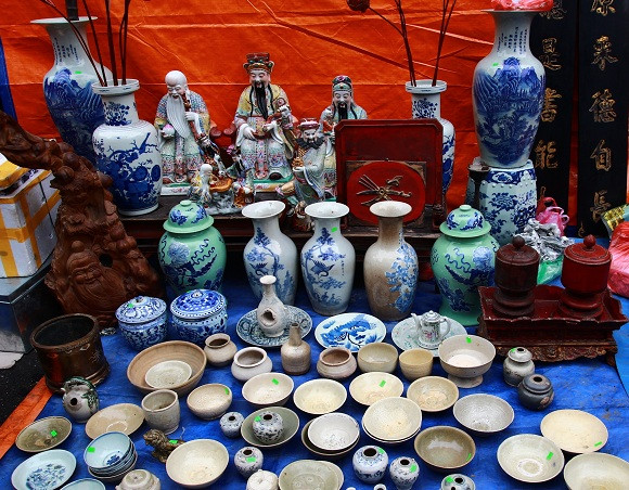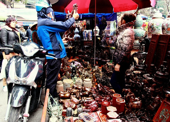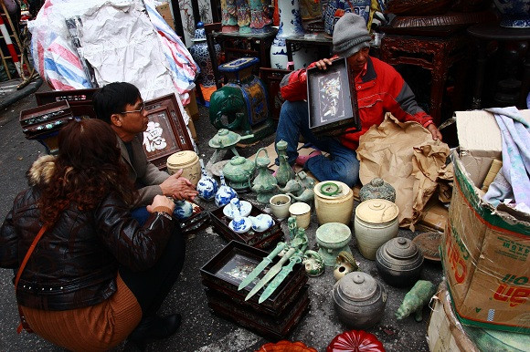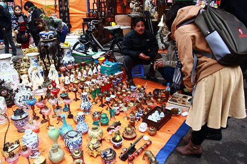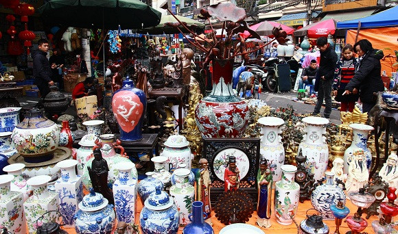 Mở cửa từ ngày 23 đến 30 tháng Chạp, phiên chợ đồ cổ họp ngay ngã 5 phố cổ Hà Nội quy tụ hàng trăm sản phẩm có giá trị cao. Đây là điểm hẹn của những người mê đồ cổ bởi những món hàng ở đây chủ yếu là đồ giả cổ, đồ đông có niên đại hàng chục đến vài trăm năm.