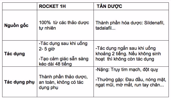 “Đối với Rocket 1h thì chỉ cần uống 1 viên trước khi quan hệ tình dục từ 2 – 5 giờ đã làm hài lòng 98% người sử dụng. Công thêm ưu điểm thành phần hoàn toàn từ thảo dược nên Rocket 1h rất an toàn. So với nhiều sản phẩm tác dụng tương đương của nước ngoài thì nó ưu việt hơn hẳn”-BS Hoàng Khánh Toàn tiết lộ.