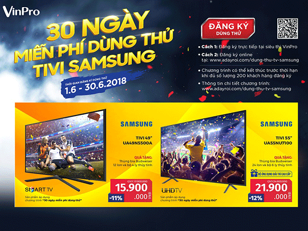 Cụ thể, chỉ với vài thao tác đăng ký đơn giản trên website Adayroi từ ngày 01/6 đến ngày 30/6/2018, người đăng ký sẽ được quyền sở hữu một trong hai model TV mới nhất của Samsung là TV 49” UA49NA5500A và TV 55” UA55NU7100 trong khoảng thời gian 30 ngày, khách hàng được hoàn trả bất kì lúc nào mà không hề tốn chi phí. Chi tiết chương trình bạn có thể tham khảo tại siêu thị điện máy VinPro bất kỳ trong các TTTM Vincom trên toàn quốc hoặc tại: https://www.adayroi.com/dung-thu-tv-samsung
