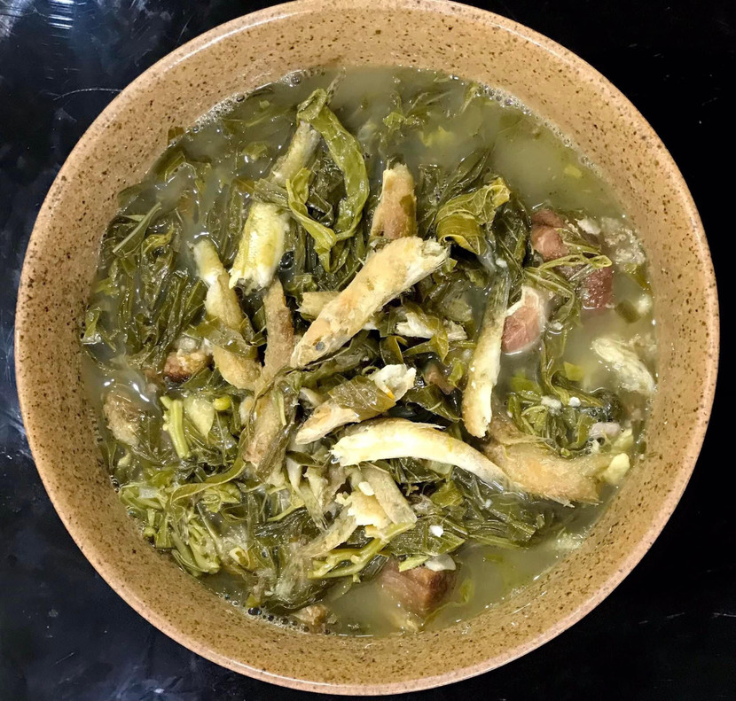 Dưa lá sắn cũng muối như dưa cải, nhưng có độ thơm hơn và lưu giữ được lâu hơn. Khi kết hợp nấu với cá, dưa thấm vào cá sẽ tạo cho món canh có vị chua dịu rất dễ ăn, lá dưa sắn càng nhai càng có độ bùi và ngọt tự nhiên. Món ăn từ dưa lá sắn không quá phổ biến, một phần do điều kiện vùng trồng, nhưng nếu ai đã từng ăn một lần sẽ chẳng thể nào quên được.