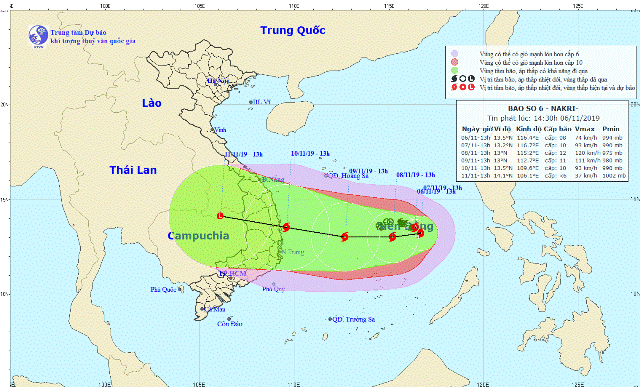Trung tâm Dự báo khí tượng thủy văn quốc gia thông tin, vào đầu giờ chiều nay, bão số 6 với tên quốc tế Nakri vẫn ở khu vực giữa Biển Đông, sức gió mạnh nhất vùng gần tâm bão mạnh cấp 8-9 (60-90km/giờ), giật cấp 11.
