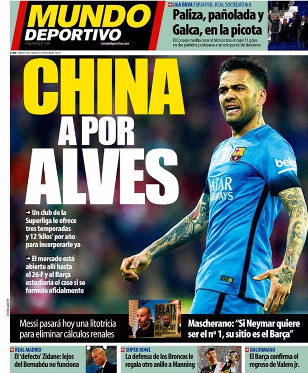 Trên trang nhất, Mundo Deportivo đã đăng tải thông tin đồn đoán về khả năng hậu vệ cánh phải của Barcelona và đội tuyển Brazil, Daniel Alves có thể chuyển tới Trung Quốc thi đấu.