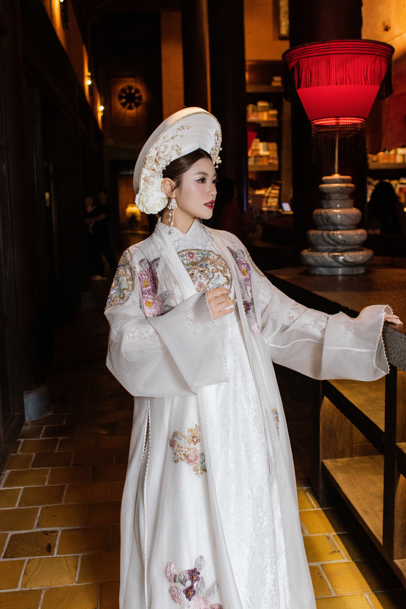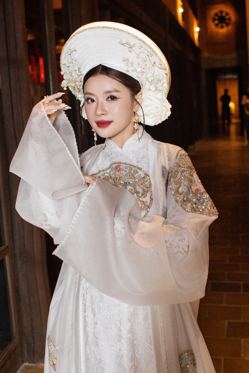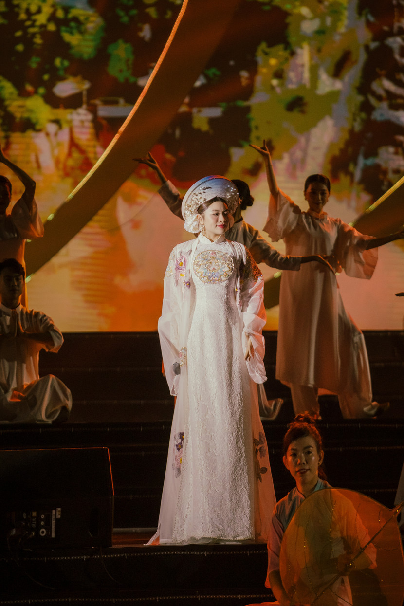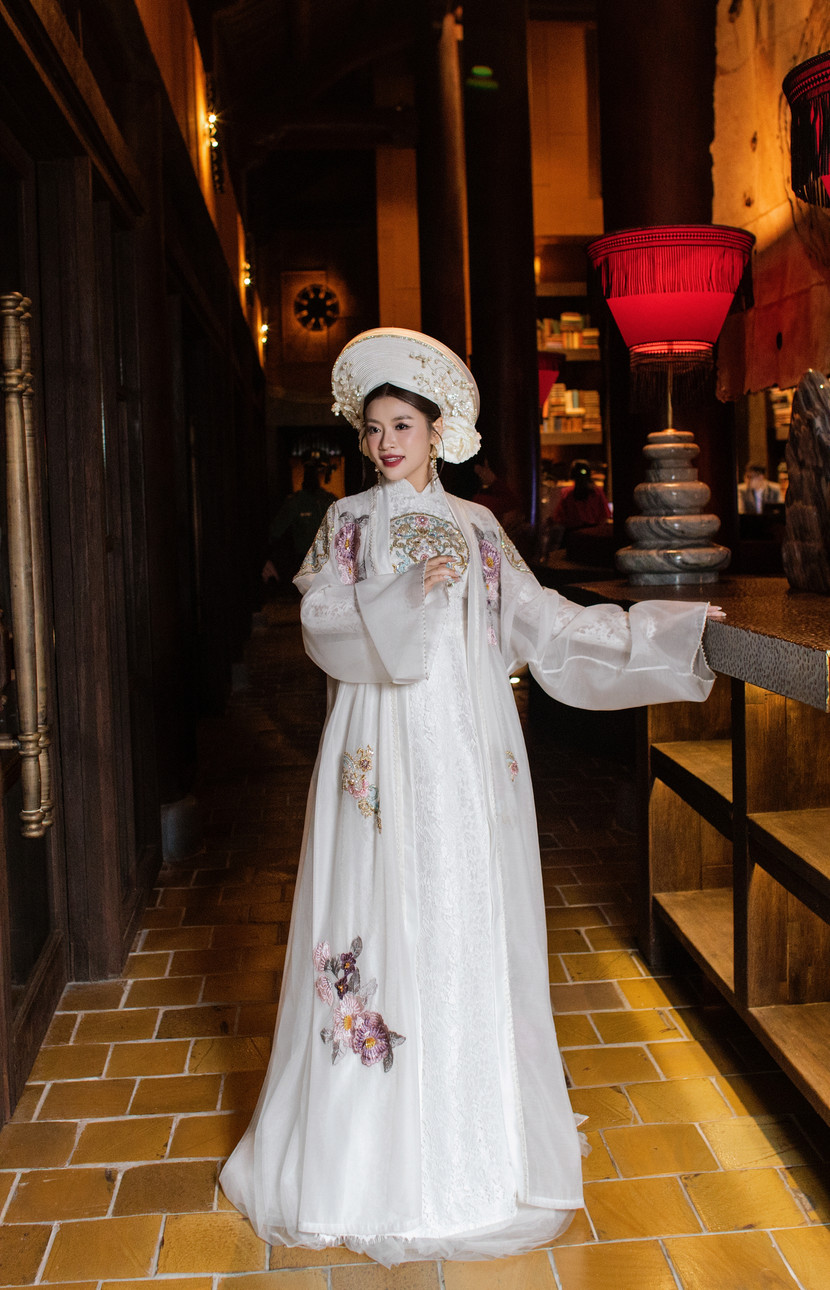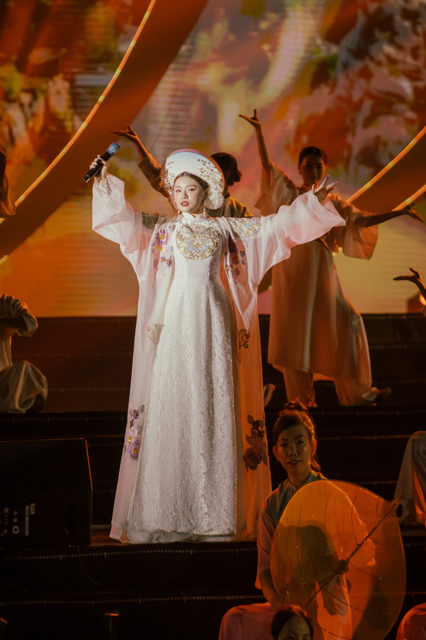 Trong không khí trang trọng, đậm sắc màu lịch sử vọng về, nữ ca sĩ đã đặc biệt lựa chọn hai thiết kế áo dài độc đáo để trình diễn. Thiết kế đầu tiên là tà áo dài trắng kết hợp với mấn đội, lấy cảm hứng từ những giá trị đặc sắc của văn hóa truyền thống Việt Nam do do nhà thiết kế Cao Minh Tiến thực hiện. Bộ trang phục gợi nhớ hình ảnh sang trọng, uy quyền của người phụ nữ quyền quý xưa, với từng đường nét, hoa văn đều toát lên vẻ quý phái, đậm bản sắc Việt.