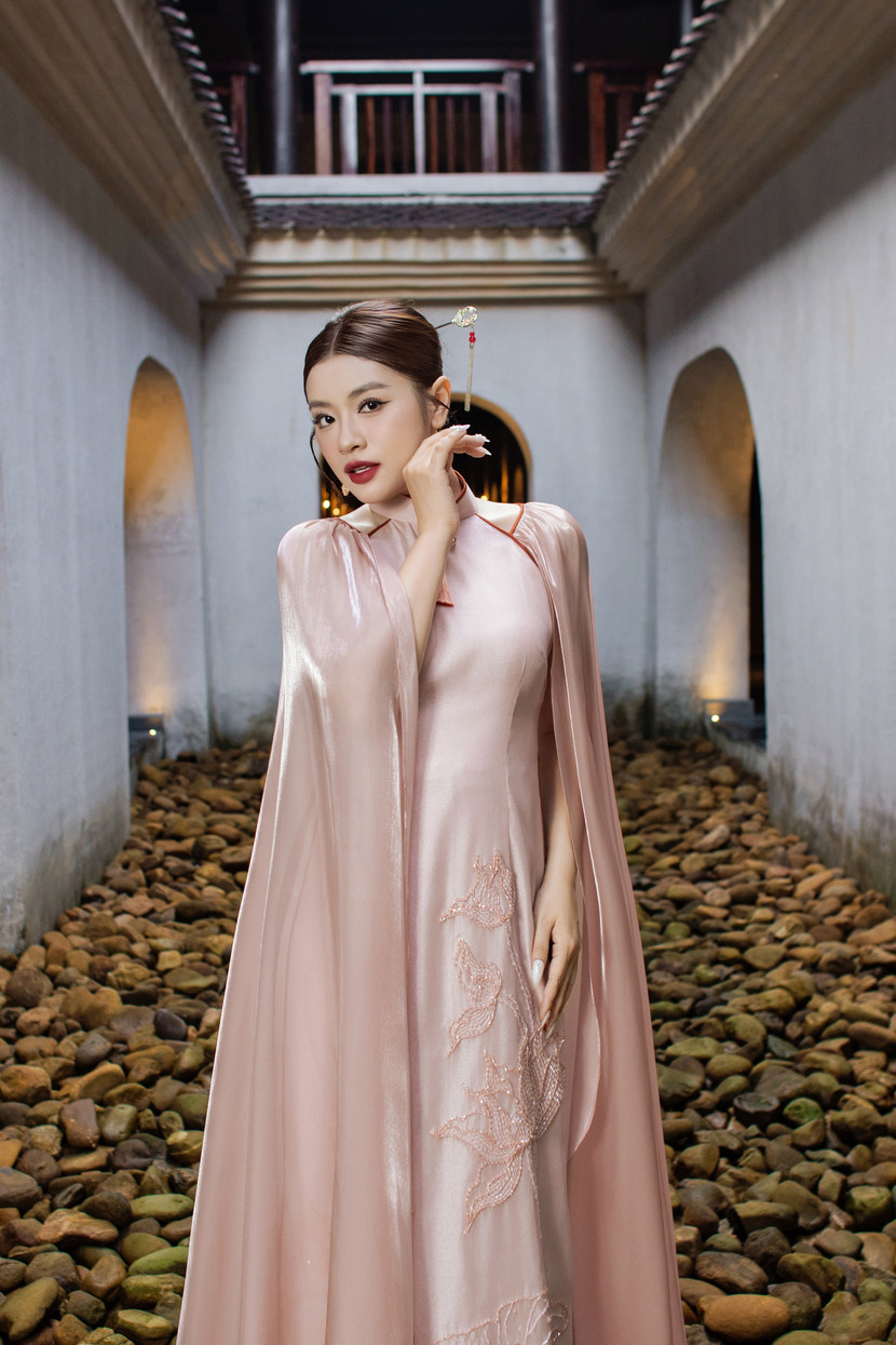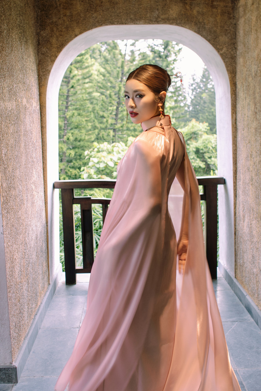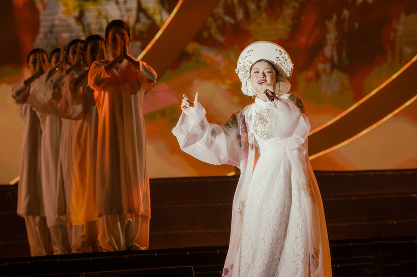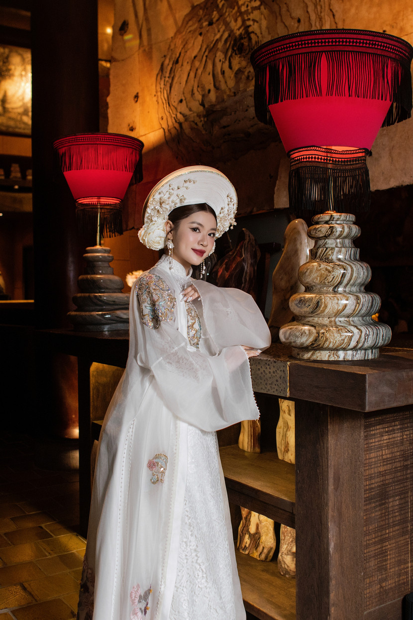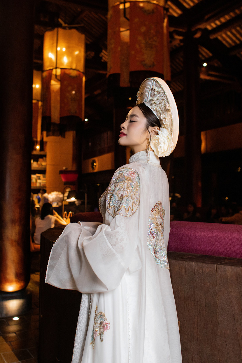 Trong không khí trang trọng, đậm sắc màu lịch sử vọng về, nữ ca sĩ đã đặc biệt lựa chọn hai thiết kế áo dài độc đáo để trình diễn. Thiết kế đầu tiên là tà áo dài trắng kết hợp với mấn đội, lấy cảm hứng từ những giá trị đặc sắc của văn hóa truyền thống Việt Nam do do nhà thiết kế Cao Minh Tiến thực hiện. Bộ trang phục gợi nhớ hình ảnh sang trọng, uy quyền của người phụ nữ quyền quý xưa, với từng đường nét, hoa văn đều toát lên vẻ quý phái, đậm bản sắc Việt.