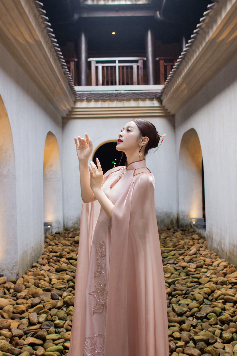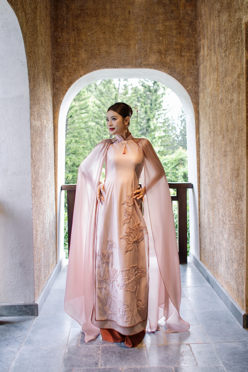 Thiết kế thứ hai là áo dài hồng pastel điểm xuyết hoa sen, mang đến cho Nguyễn Thu Hằng vẻ đẹp thanh tao, thoát tục, giúp cô tỏa sáng trong từng khoảnh khắc trình diễn. Cả hai thiết kế đã trở thành điểm nhấn, song hành cùng giọng hát đầy cảm xúc của cô để truyền tải trọn vẹn tinh thần và thông điệp của các ca khúc.