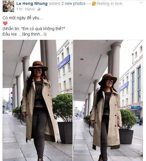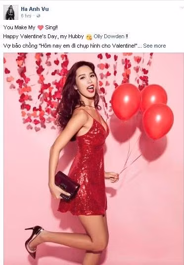 Tuy nhiên, Hà Anh đã kịp trấn an chồng bằng status đầy ngọt ngào: “Ra là chàng cũng biết tị với anh chàng nào chụp hình với vợ đấy. Rất tiếc là nàng thì chẳng nghĩ đến anh chàng khác nào ngoài chàng cả. Mất oai quá! Mất khí thế quá!”. Cùng với câu chuyện về anh chàng của mình, Hà Anh cũng không quên gửi lời chúc Valentine tới mọi người: “Chúc cả nhà một ngày Valentine hớn hở như nàng trong tấm hình này, dù có bồ hay không bởi ta vẫn có thể hạnh phúc với chính ta phải không mọi người! Love you all”.